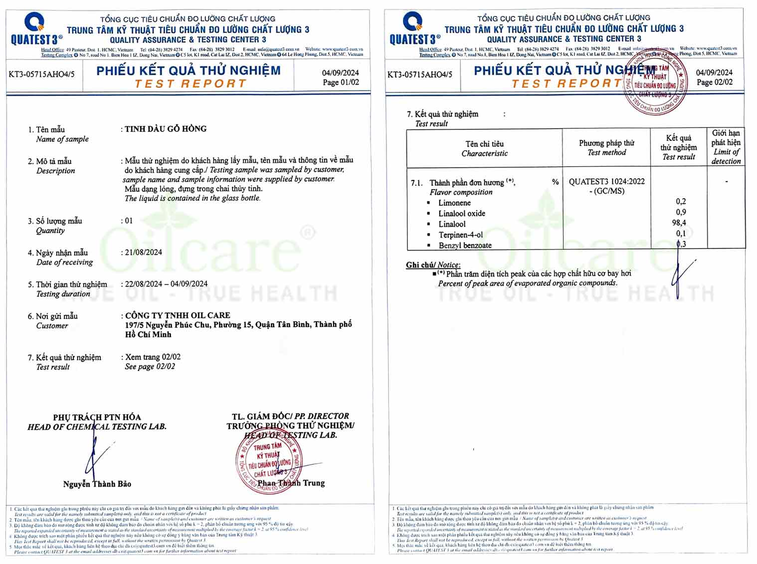Xem chi tiết bảng kiểm nghiệm chất lượng Tinh Dầu Gỗ Hồng bán buôn mới nhất của QUATEST 3