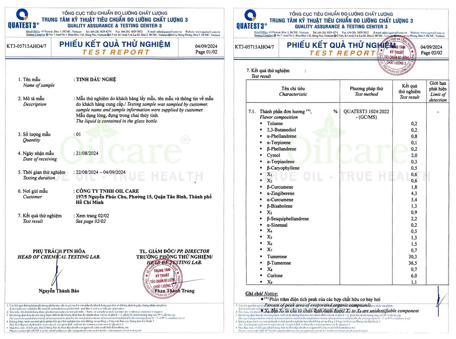 Xem chi tiết bảng kiểm nghiệm chất lượng Tinh Dầu Nghệ bán buôn mới nhất của QUATEST 3
