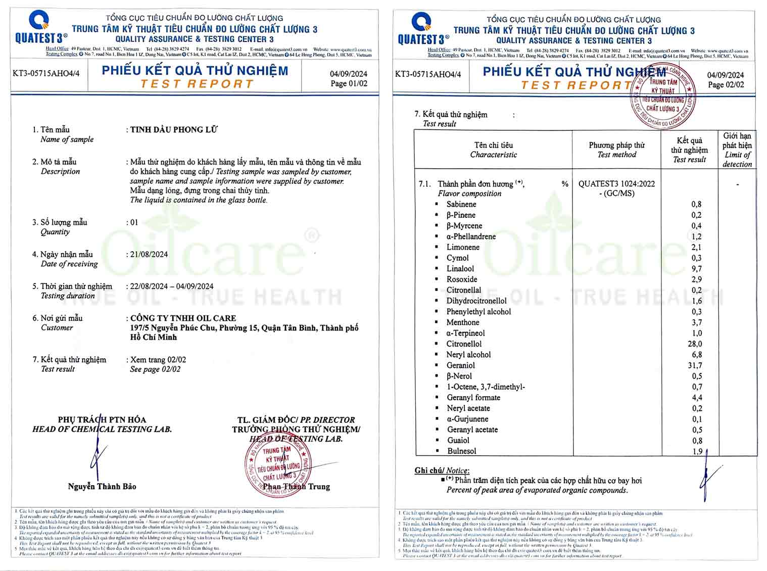 Xem chi tiết bảng kiểm nghiệm chất lượng Tinh Dầu Phong Lữ bán buôn mới nhất của QUATEST 3